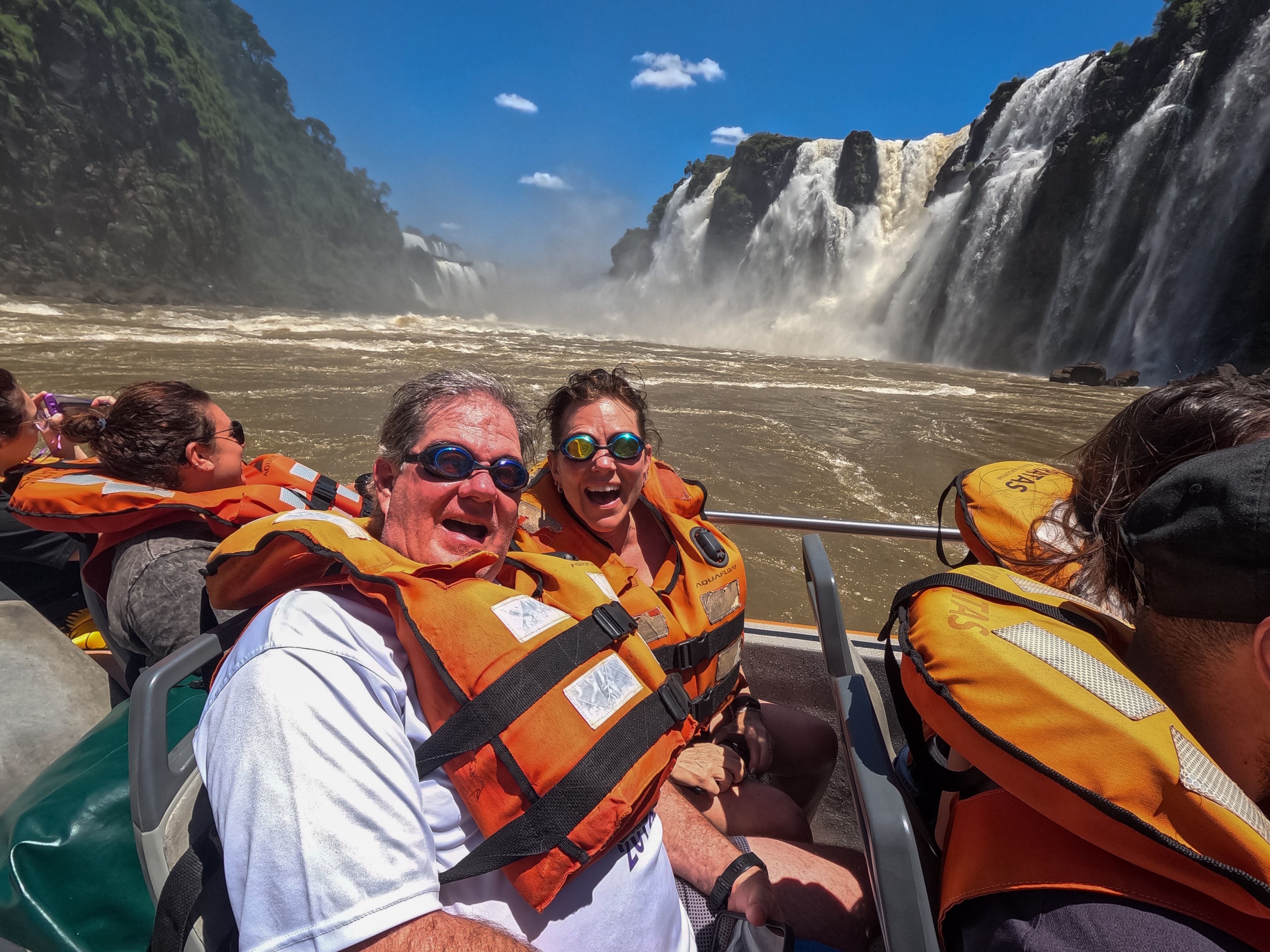 | A Speedboat Adventure Up-Close the Iguazu Falls Get ready for a thrilling speedboat adventure, enjoying a unique, up-close perspective of the majestic Iguazu Falls and experience a different viewpoint of the falls from what you’ll see from the panoramic boardwalks. Our speedboat will zip the waters of the Iguazu River and approach the falls getting thoroughly splashed by their mist as you hear their loud roar! This ride provides a unique and extremely close-up view of the San Martin and Three Musketeers falls with the opportunity to take outstanding close-up photos. The high point of this experience will be without a doubt, being showered under the mist of the San Martin Falls; the second strongest falls in the Iguazu system. To get to the boat dock you’ll ride a truck through the jungle and continue with a navigation up the Iguazu River canyon by the river rapids. Now it’s time to hop on board and begin our waterfall adventure! This tour lasts about 2 hours and is done on the same day you do the Argentine side of the falls tour. |